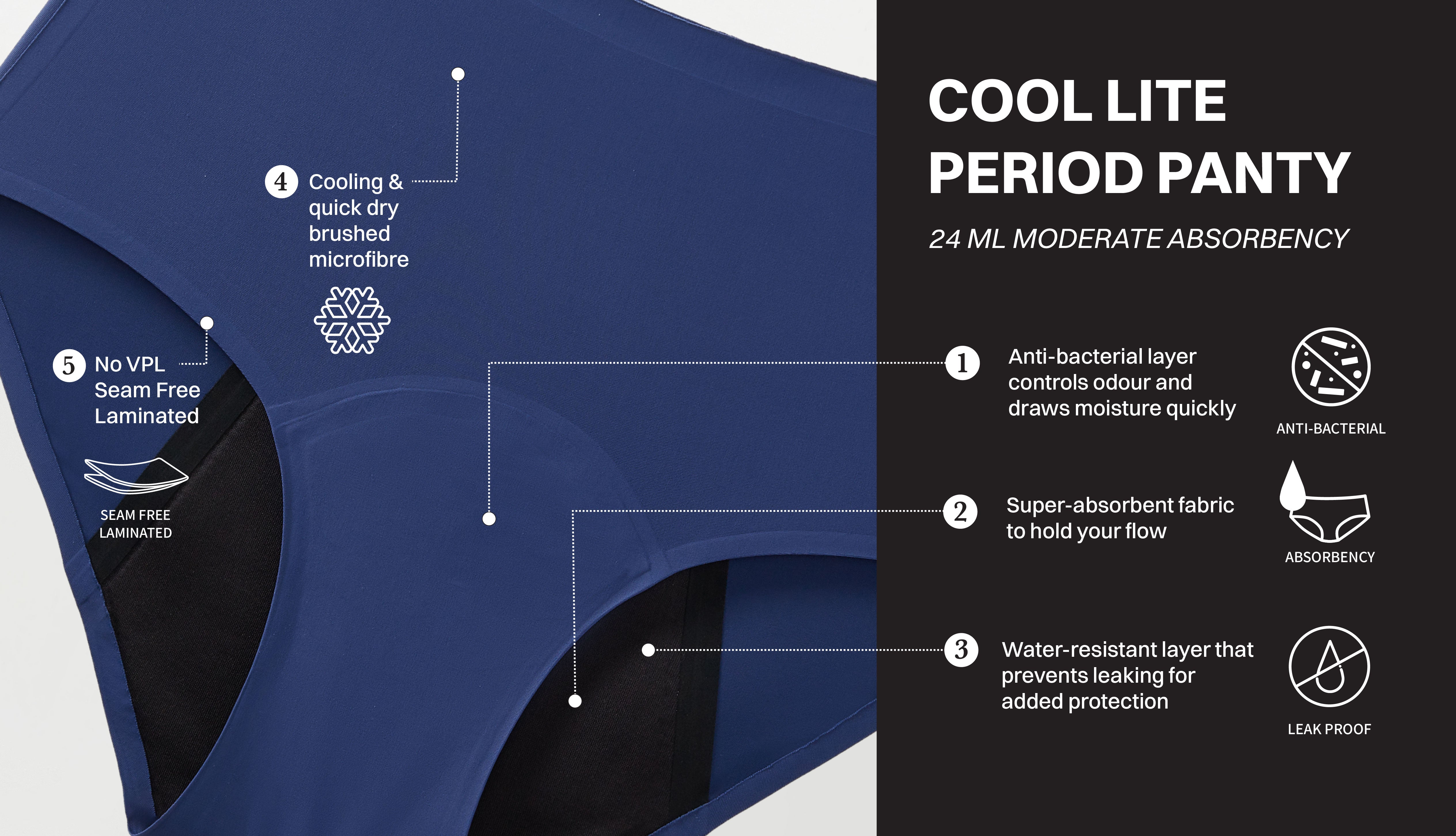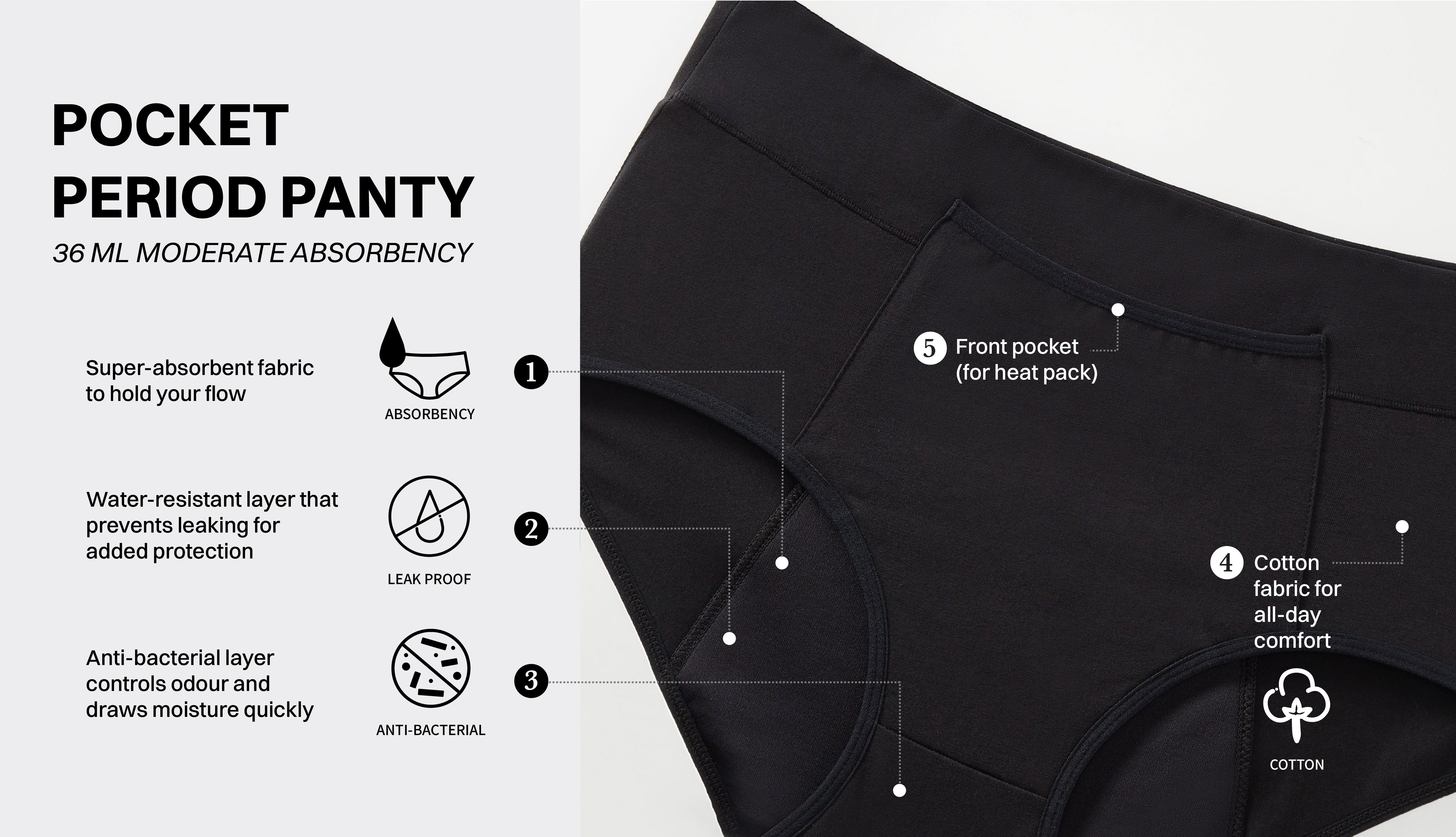 Our period panties come in two different absorbency levels – moderate and heavy. The moderate absorbency panty is equivalent to one regular pad, two tampons or 18ml flow. It is more suitable for use when there is lighter flow.