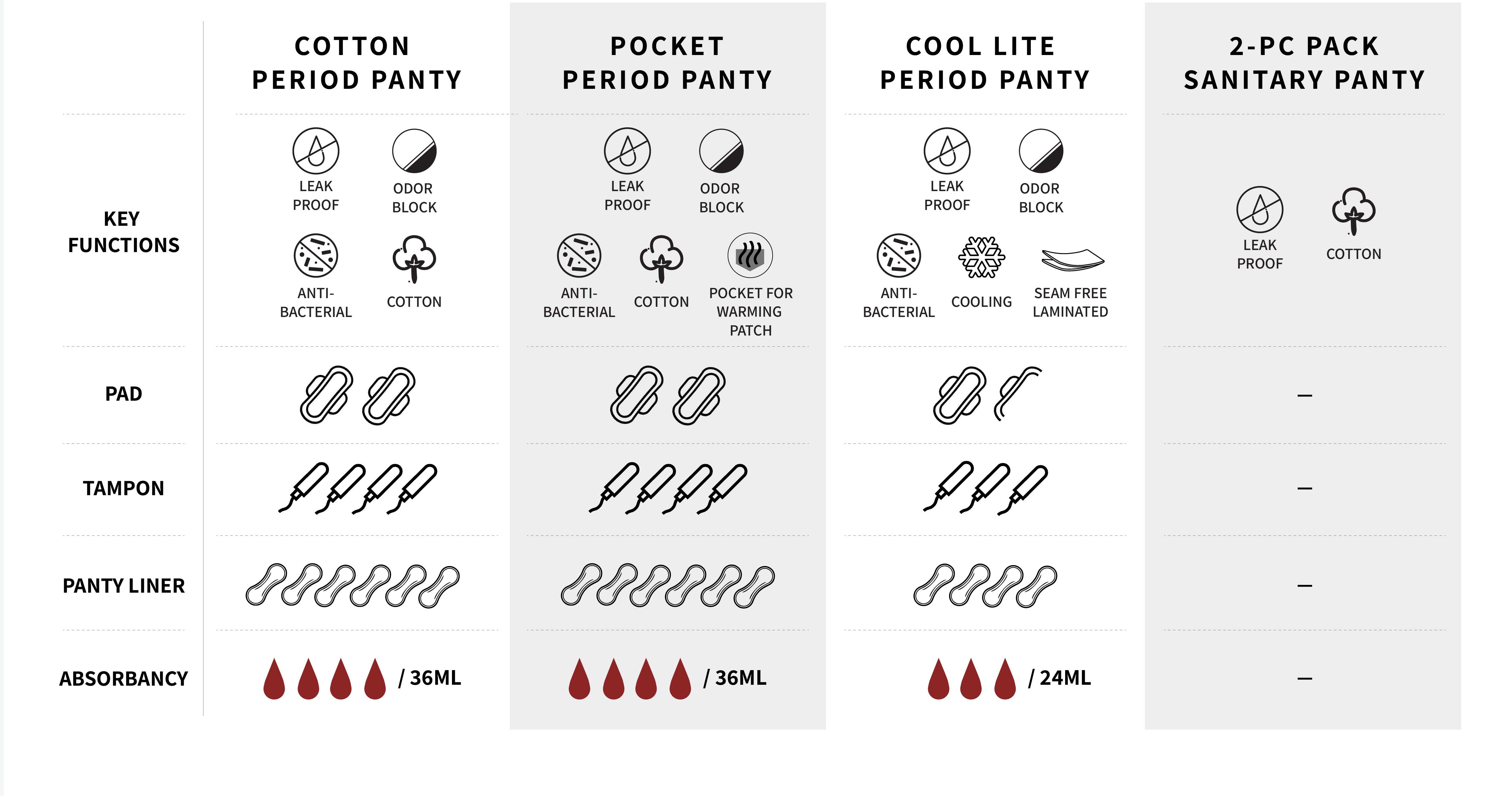 Period panties are different as they are made to replace sanitary pads and tampons altogether. Both products have a leak-proof layer but sanitary panties do not have an absorbent layer like period panties do.